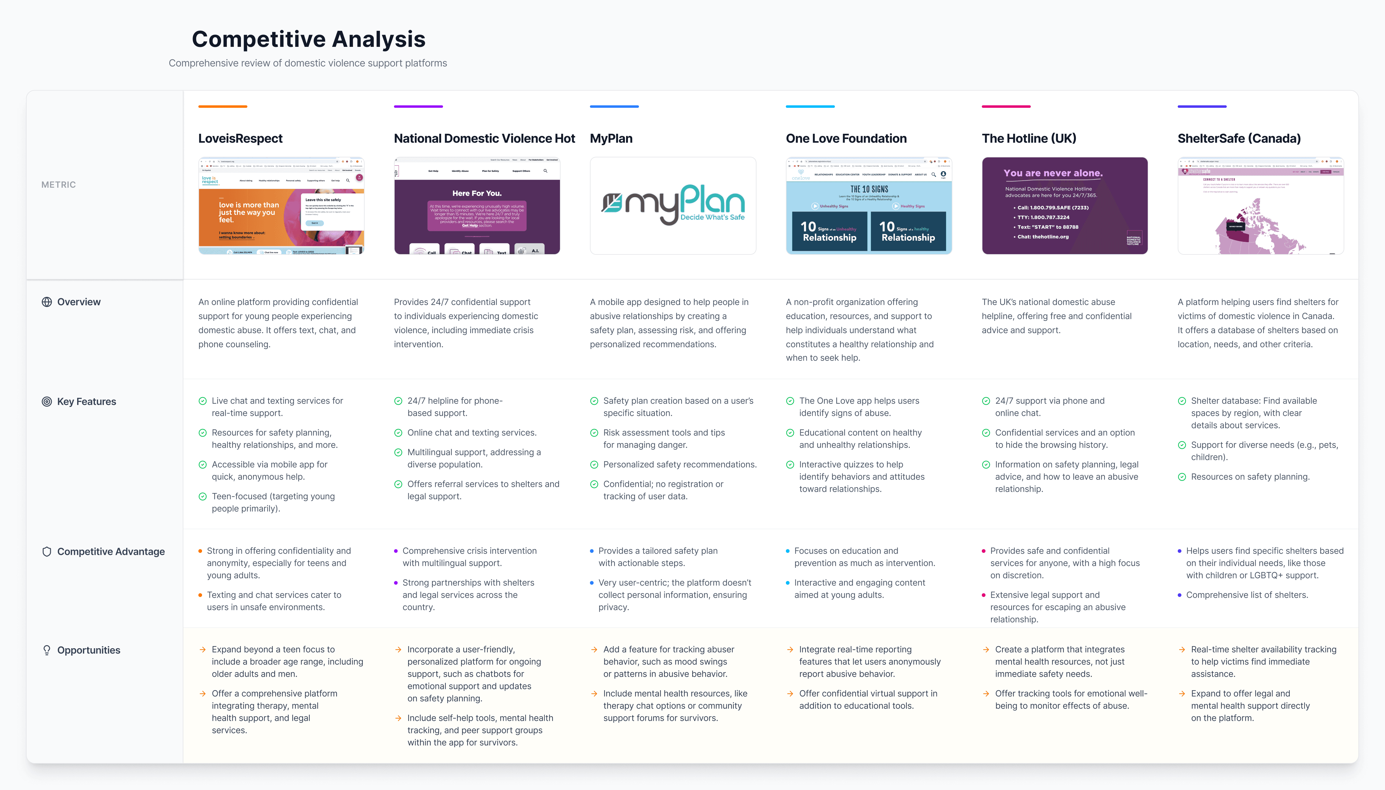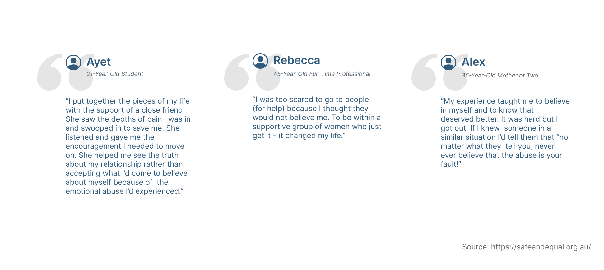 I sourced testimonies from survivors published by support organizations and online campaigns to better understand lived experiences, emotional needs, and real-world barriers to seeking help. These narratives offered insight into moments of hesitation, fear, and decision-making that formal reports often overlook. By analyzing recurring themes—such as safety planning, financial dependence, isolation, and mistrust of systems—I was able to ground design decisions in authentic voices rather than assumptions.