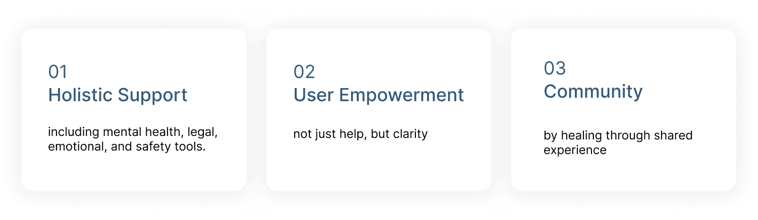 We identified key challenges including fear of discovery, dependency, isolation, identity loss, and deep emotional trauma. Research revealed that many survivors don’t label their experiences as abuse, stay silent due to fear or stigma, and lack awareness of available legal or emotional support. These patterns informed features such as discreet app access, emergency contacts, risk assessments, community support forums, and secure document storage.