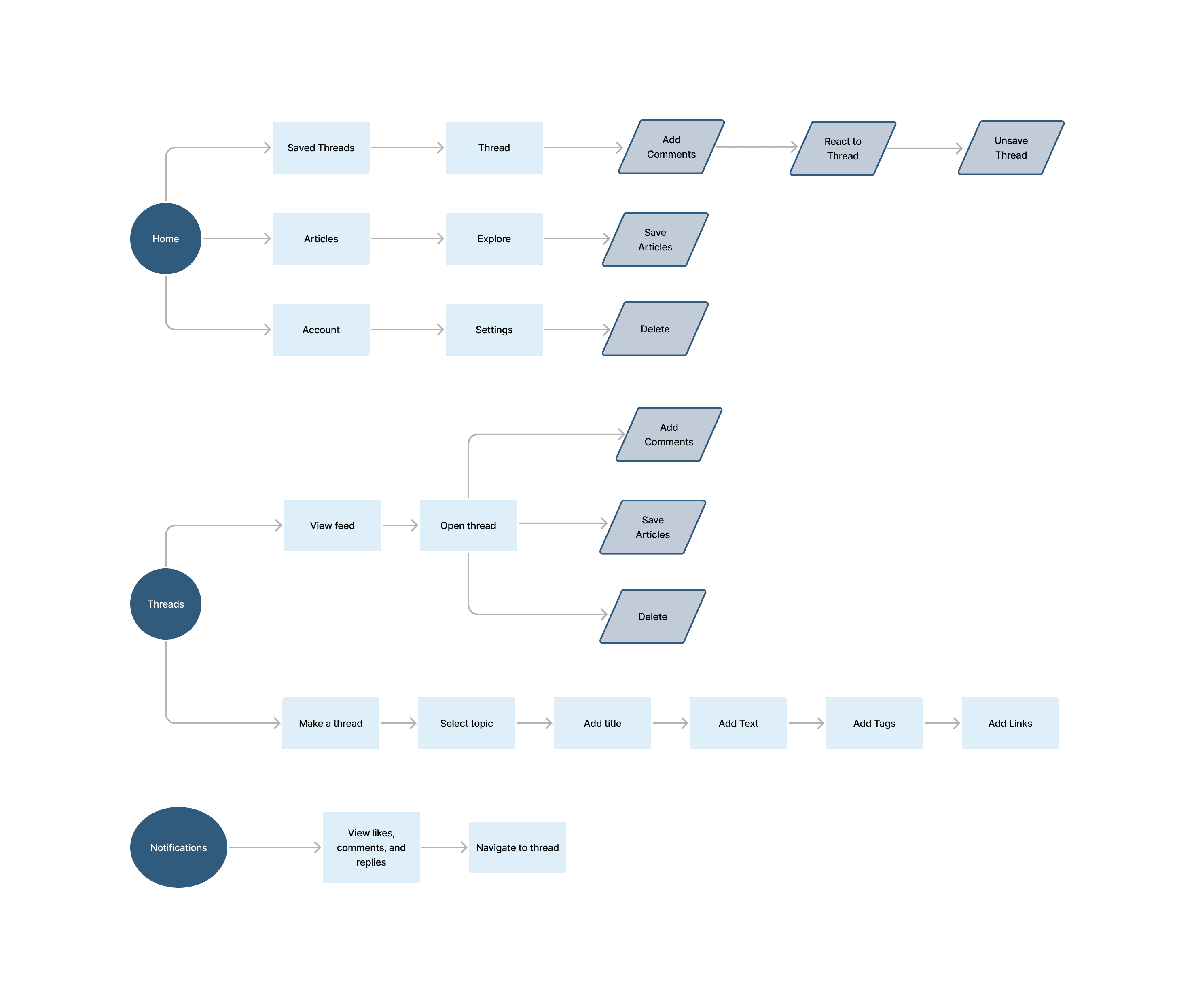 To establish a rough outline, I developed a guiding framework for the app, envisioning the registration, accessibility to resources, community, and discreet exiting processes. The information architecture helped us pinpoint which of our three main issues—security, clarity, and empathy—we needed to focus on for each page.